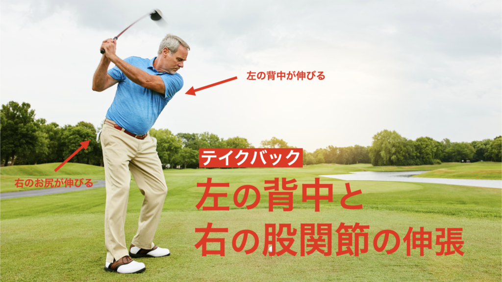 特にゴルファー(右打ち)の方は、例えばテイクバックの際に、左の背中と右の股関節の可動性を活用することによって、しっかりと股関節に力を溜めることができるようになります。